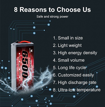 | 6500mAh | 3S 13.3V | 77Wh | 145*53*19mm | 290g | 32a | 65a | 263Wh/kg |